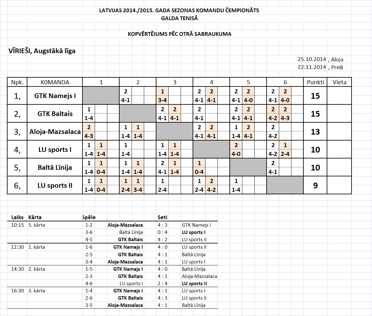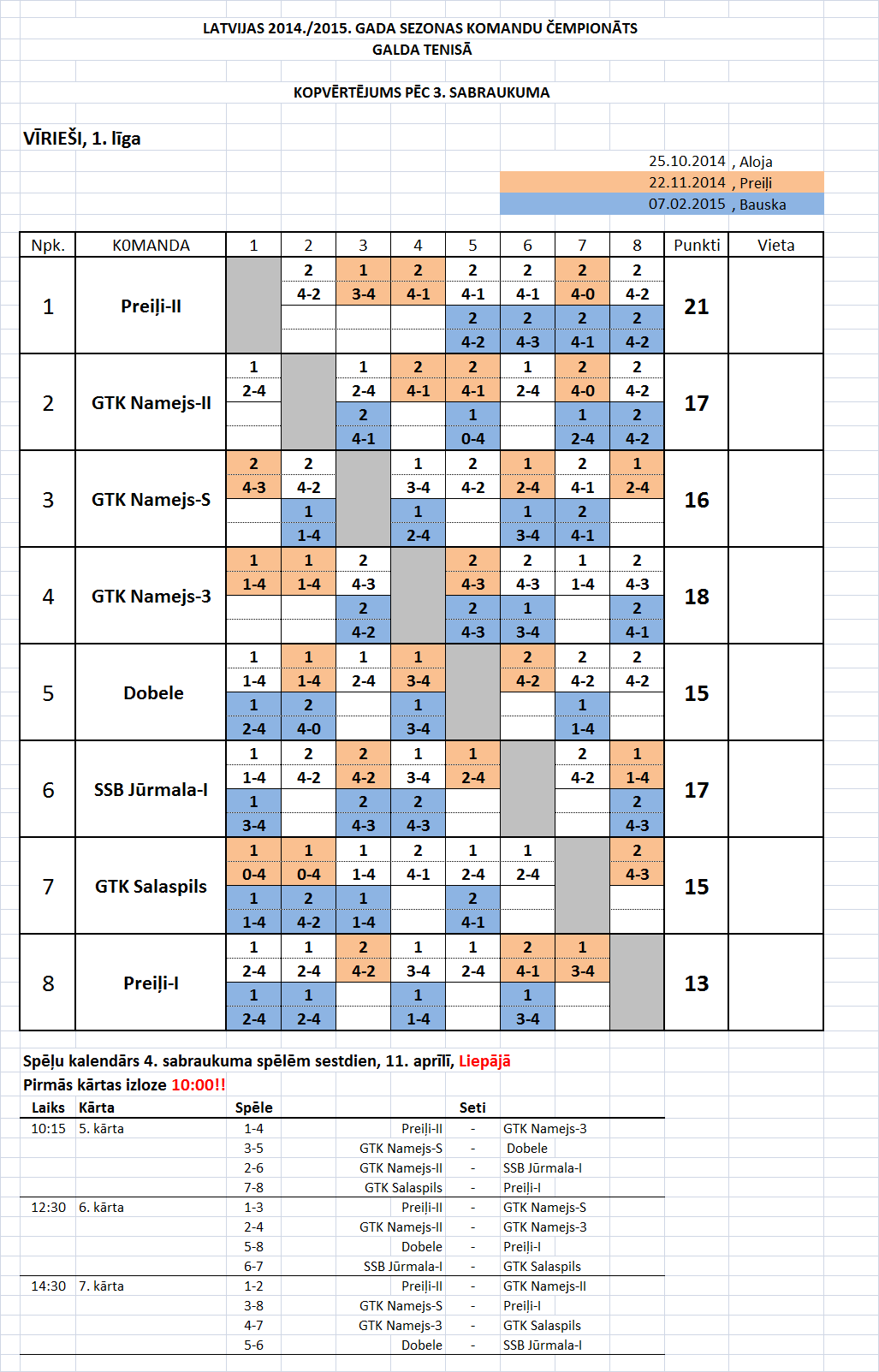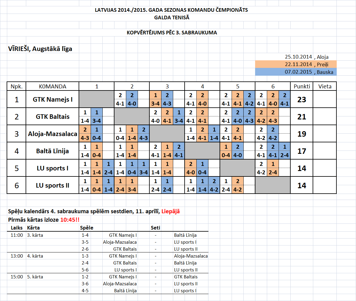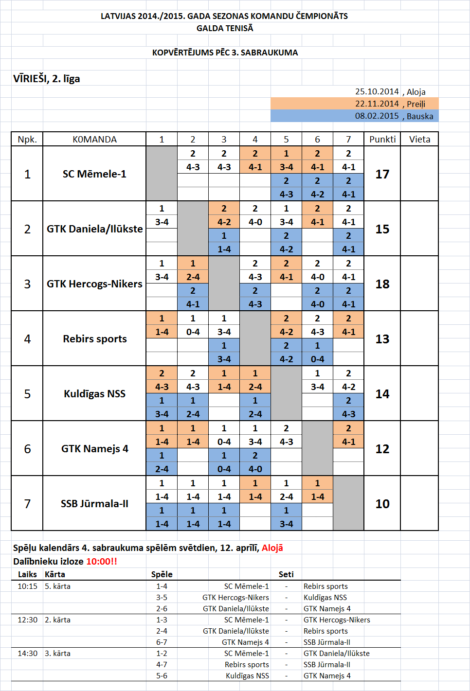 - Высшая лига (мужчины) Таблица игр-4й съезд, Лиепая, 11.04.2015., начало в 10:45.