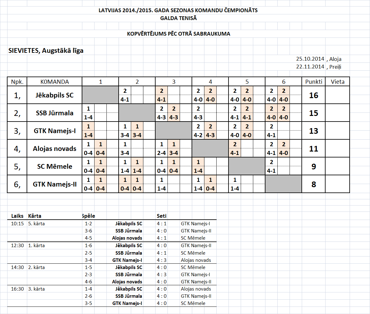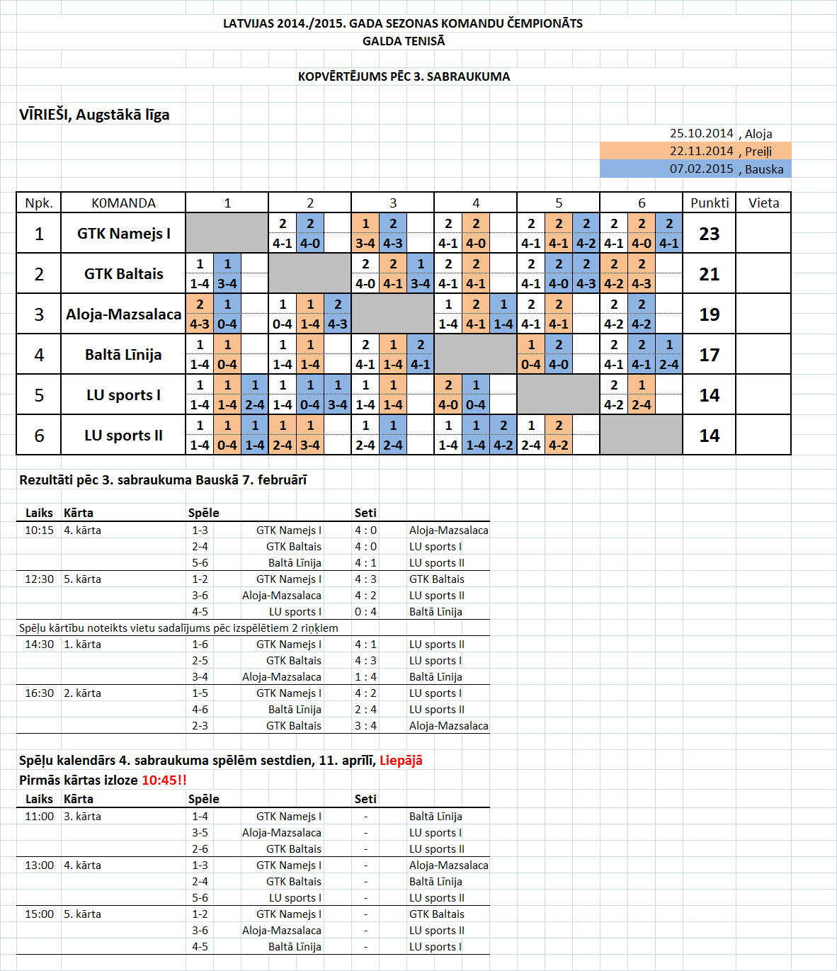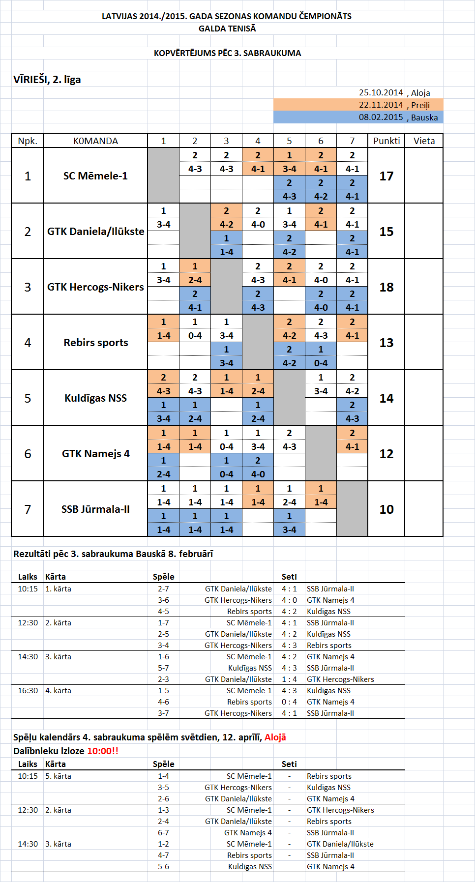 - Высшая лига (мужчины) Таблица игр-4й съезд, Лиепая, 11.04.2015., начало в 10:45.