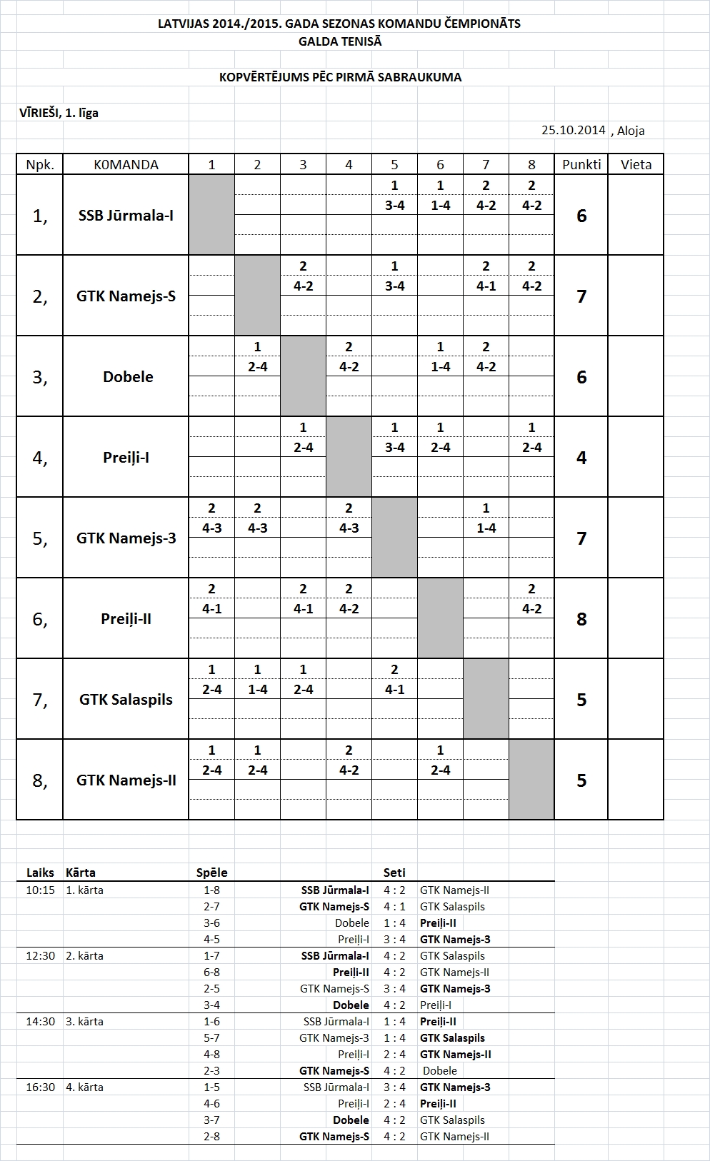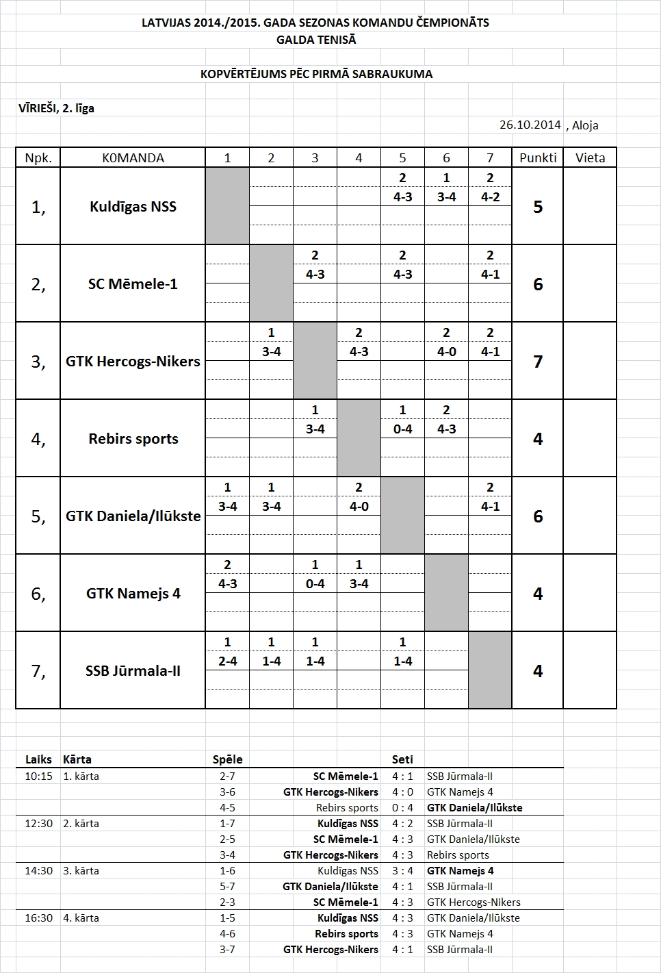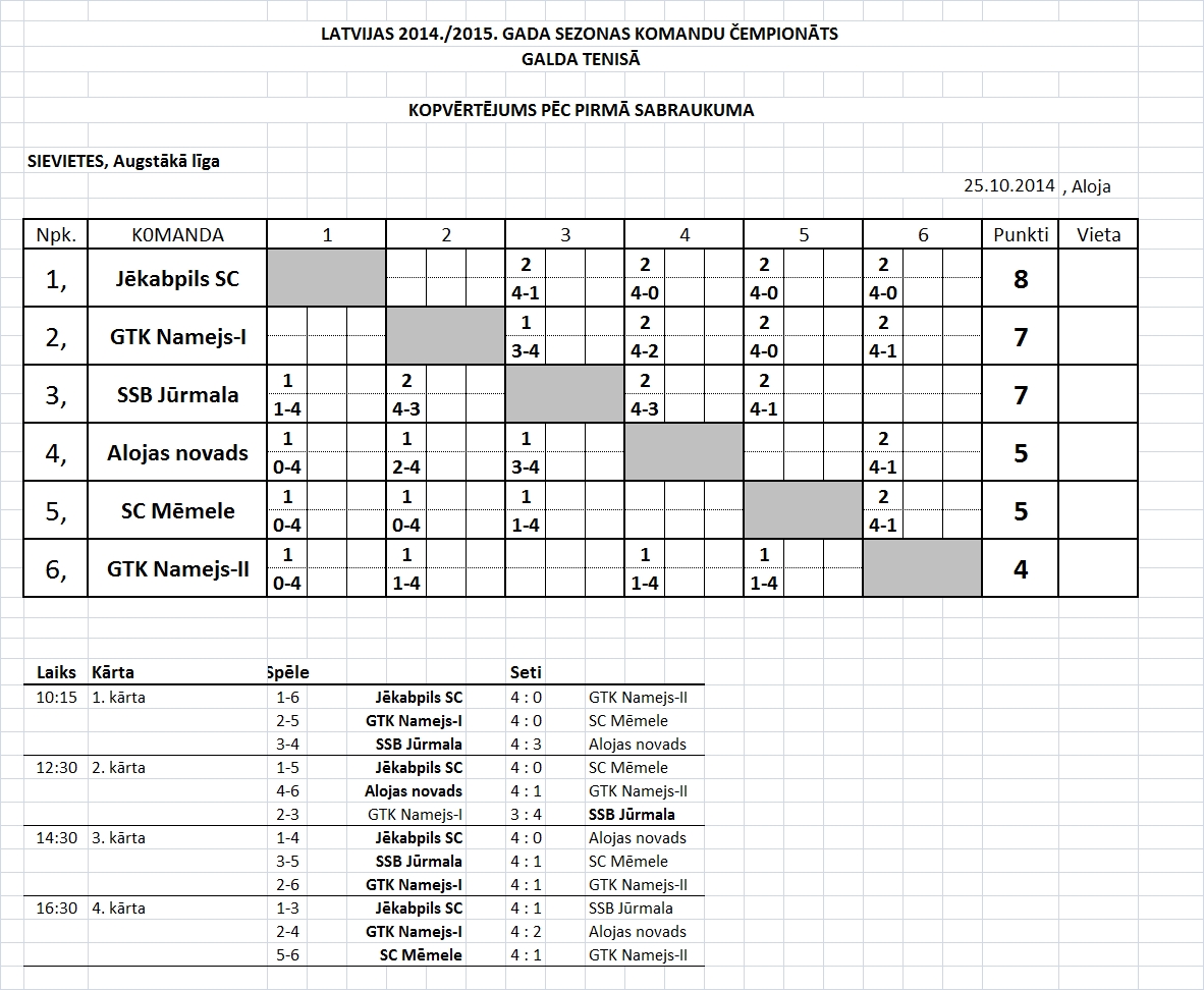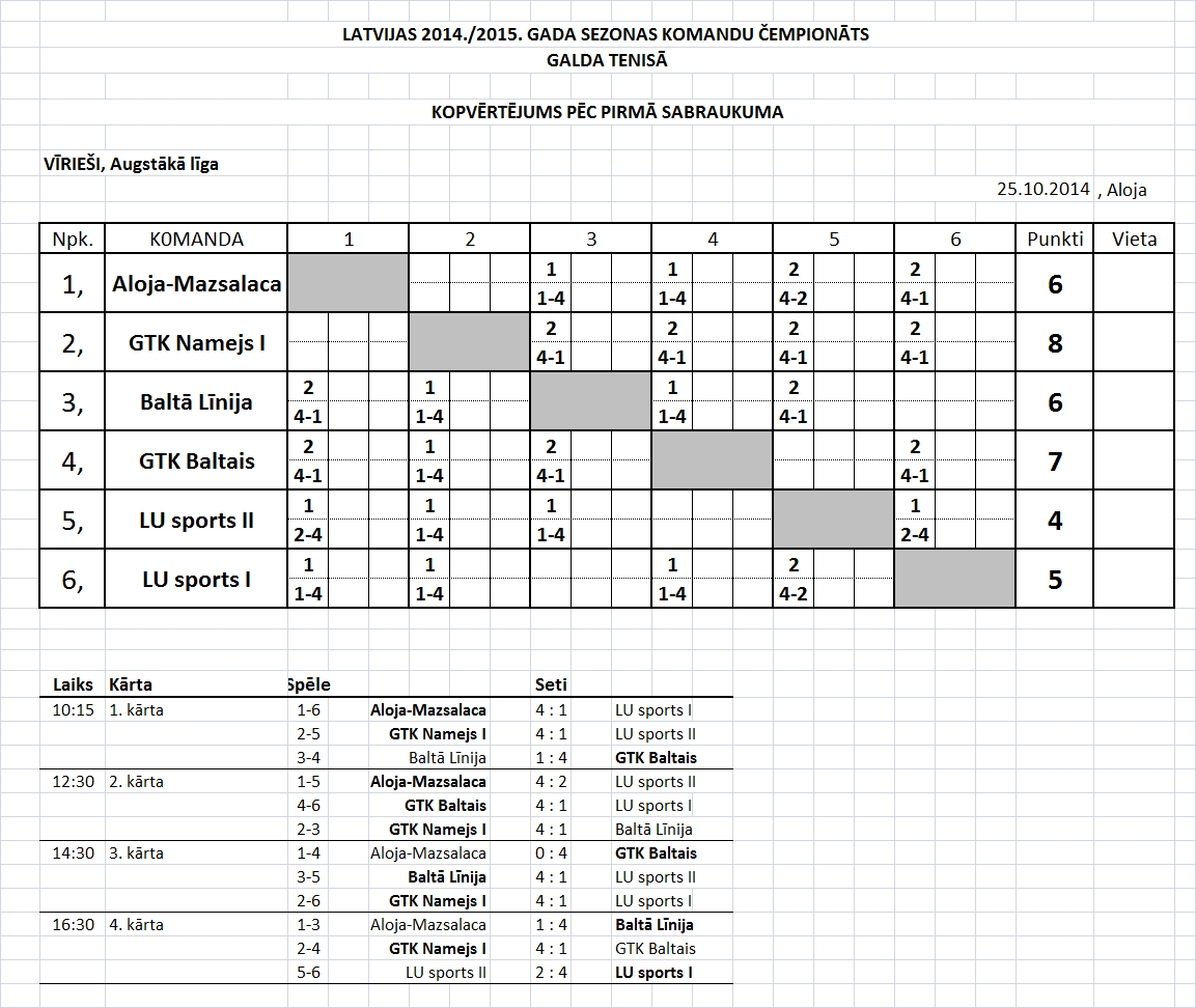 - Высшая лига (мужчины) Таблица игр-4й съезд, Лиепая, 11.04.2015., начало в 10:45.