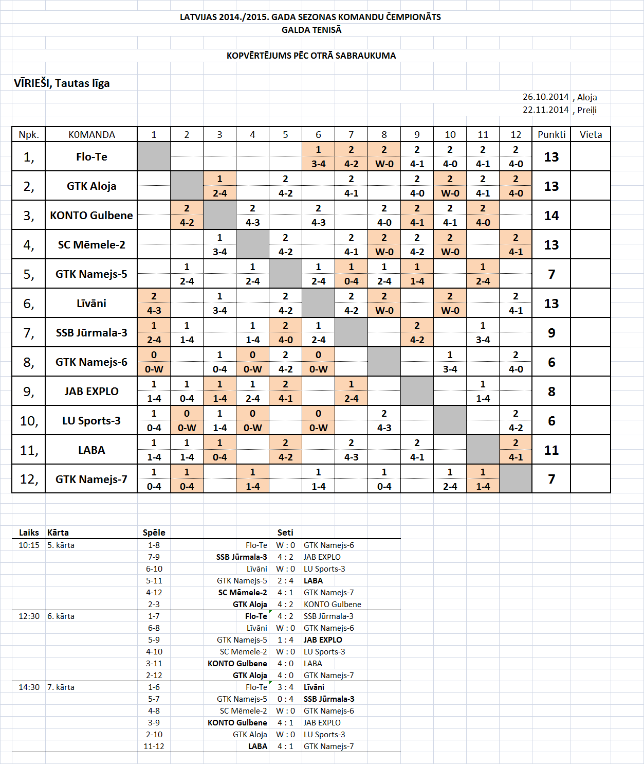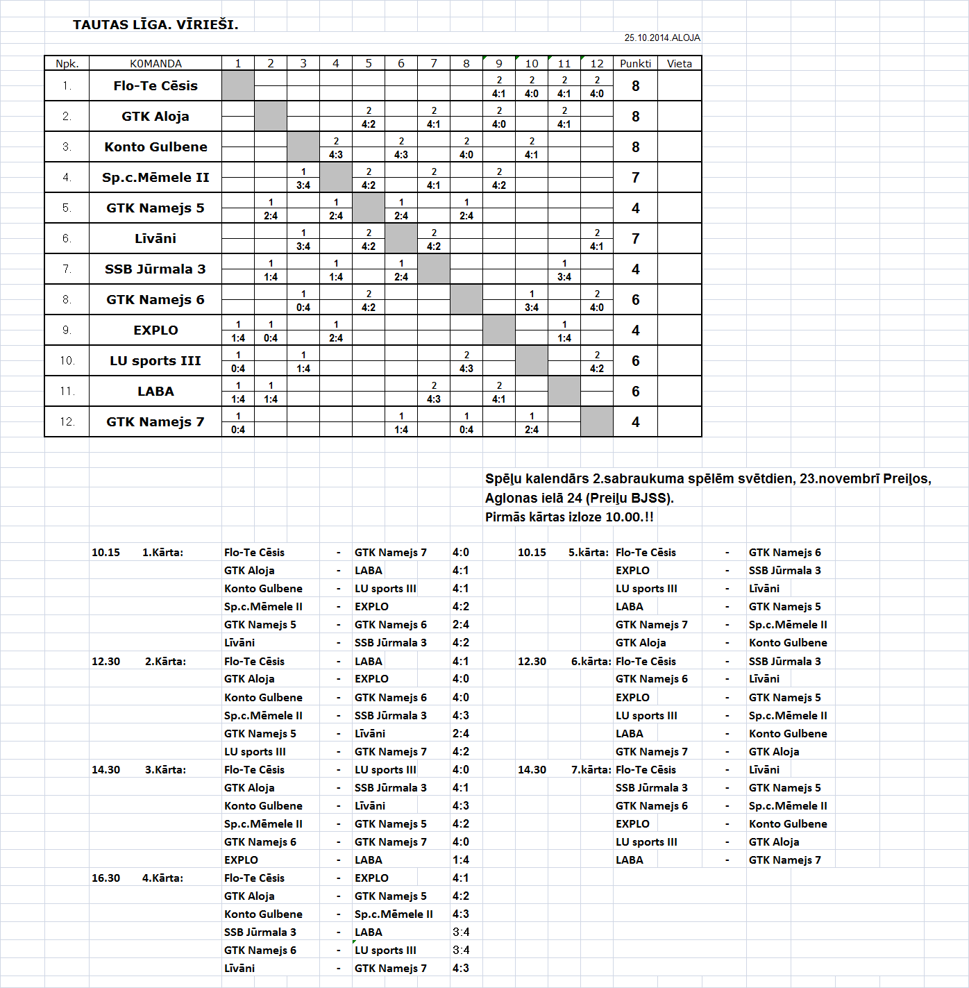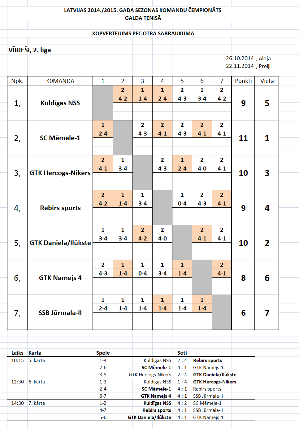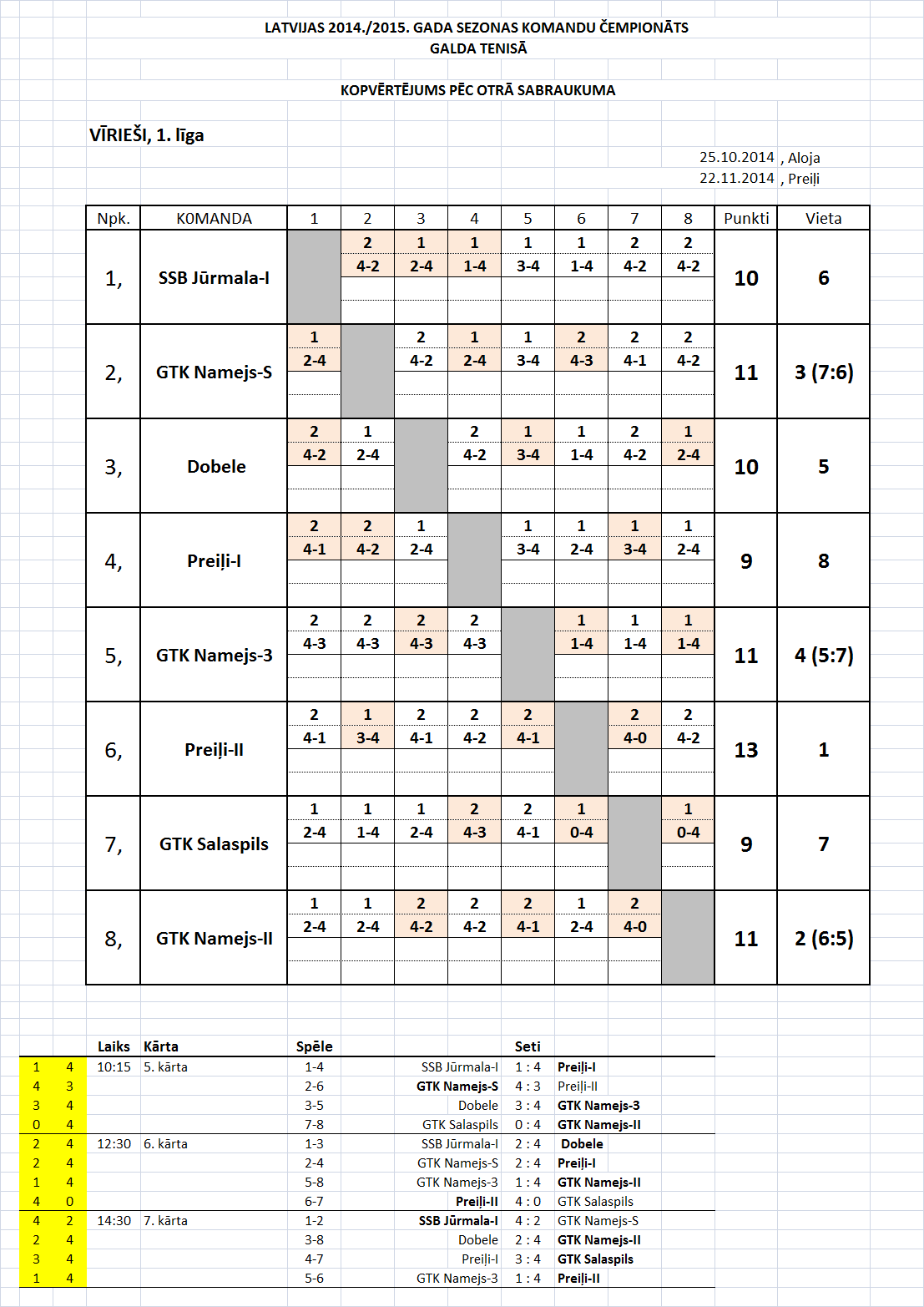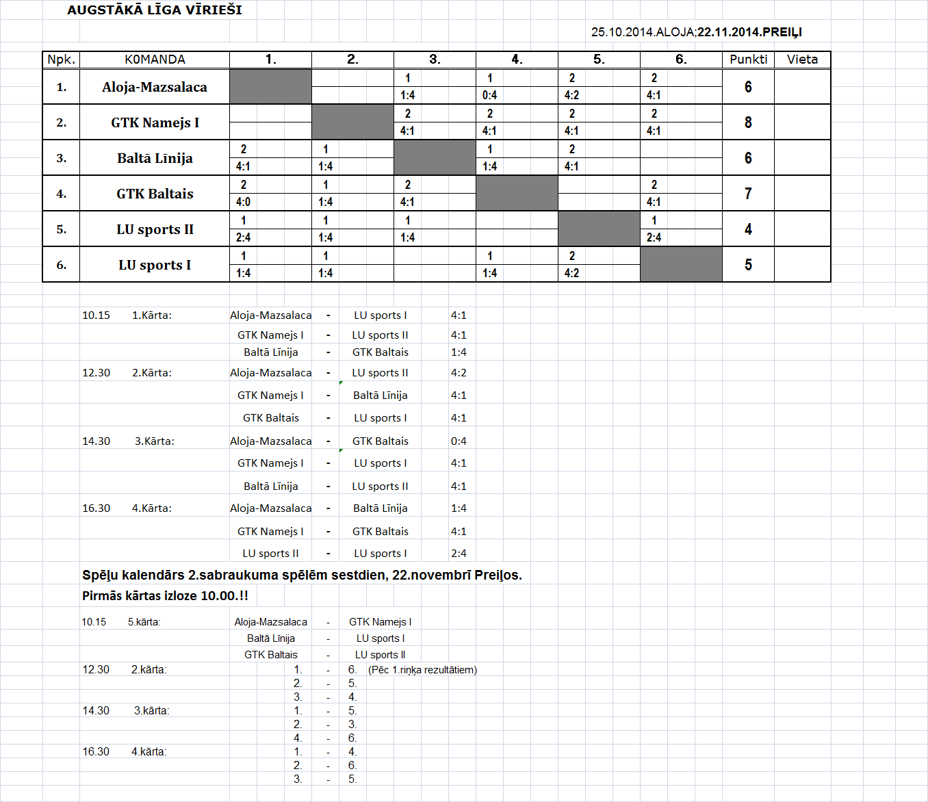 - Высшая лига (мужчины) Таблица игр-2й съезд, Прейли, 22.11.14.