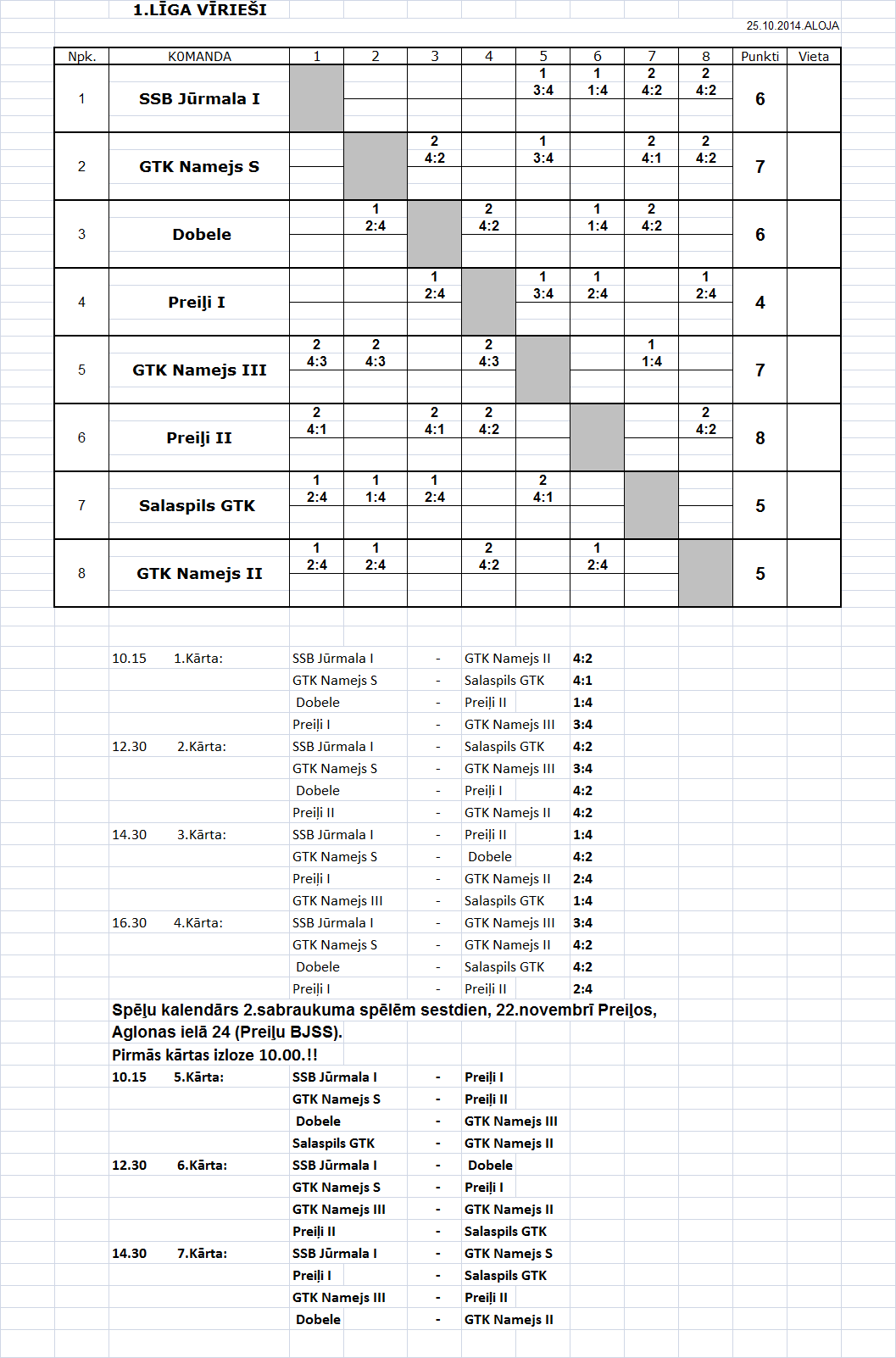 - 1-ая лига (мужчины) Таблица игр-2й съезд, Прейли, 22.11.14.