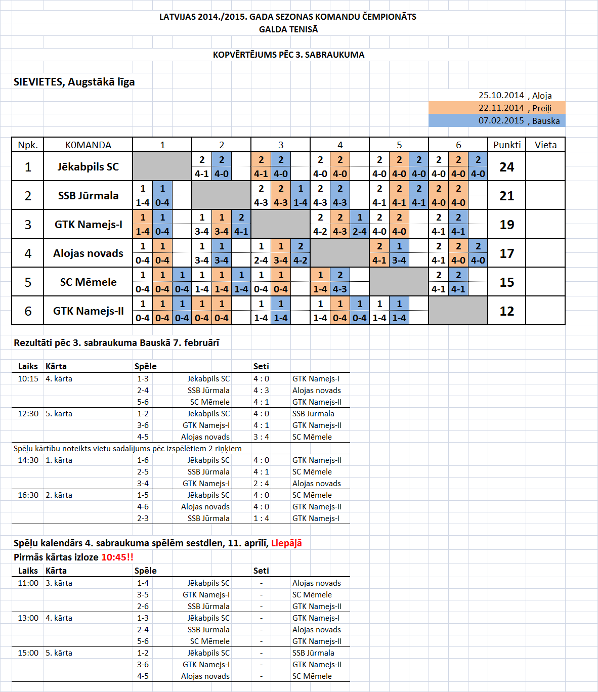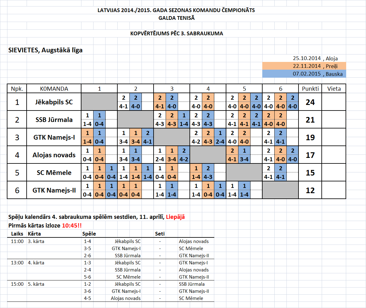 - Высшая лига (женщины) Таблица игр-4й съезд, Лиепая, 11.04.2015., начало в 10:45.