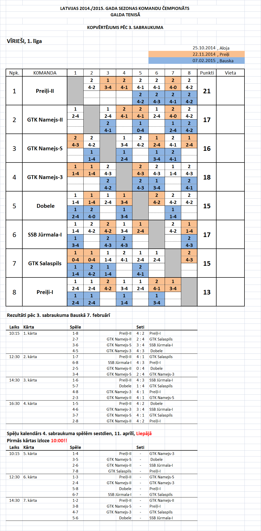 - 1-ая лига (мужчины) Таблица игр-3й съезд, Бауска, 07.02.15.