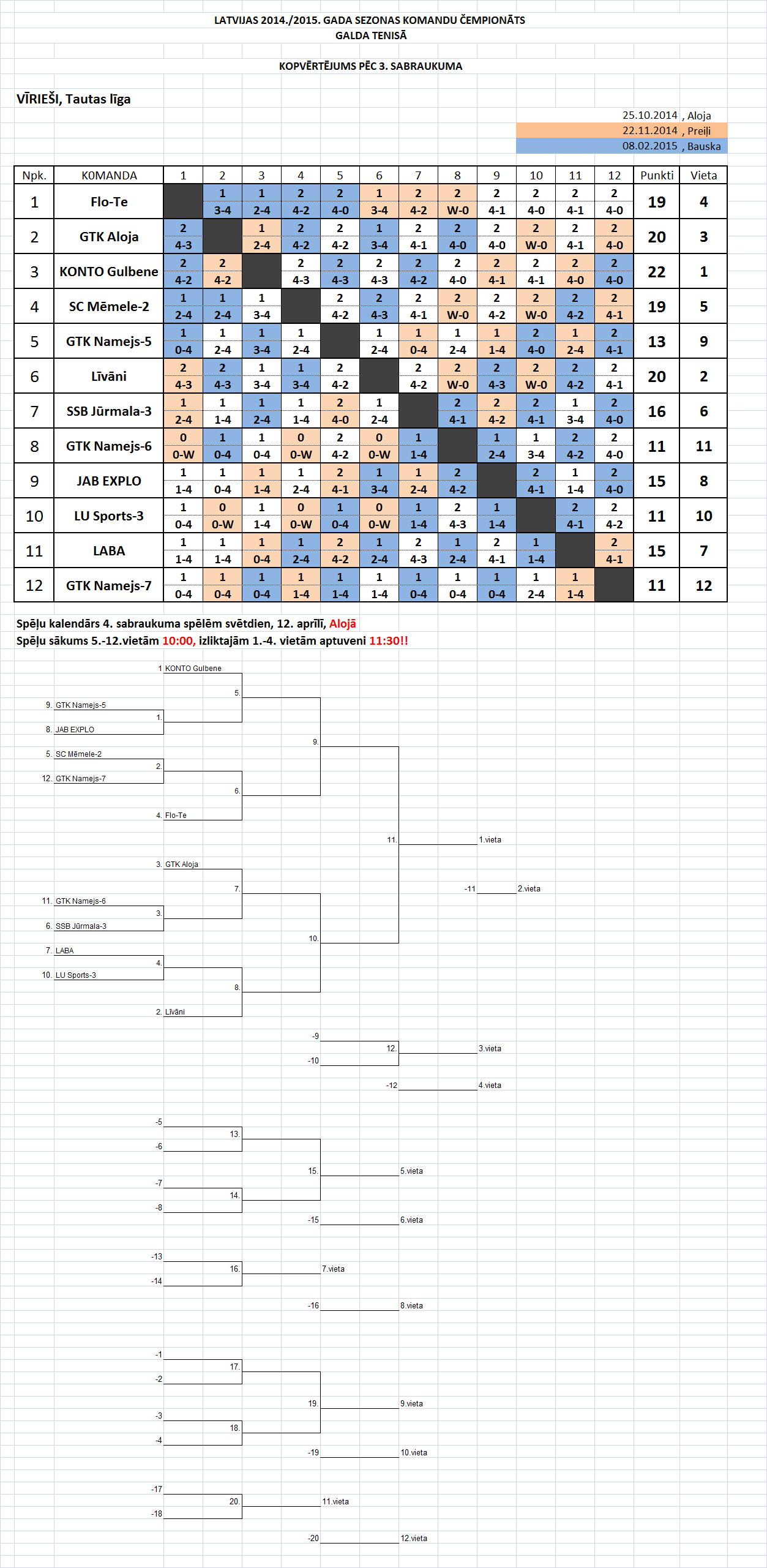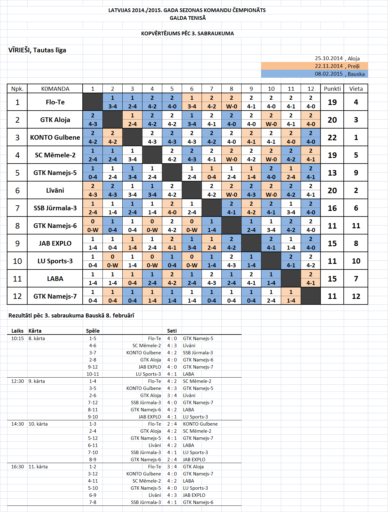 - Высшая лига (мужчины) Таблица игр-3й съезд, Бауска, 07.02.15.